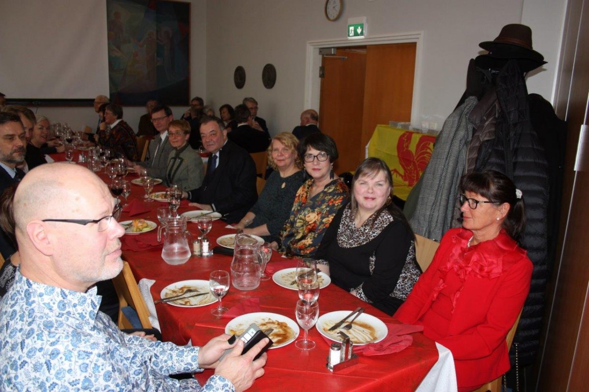 Belgian Suomen-suurlähettiläs, hänen korkea-arvoisuutensa, Herra Alexis de Crombrugghe sekä Madame Isabelle Fontaine Valloniasta kunnioittavat yhdistyksen juhlaa läsnäolollaan. On myös mahdollista, että lähetystön muutakin henkilökuntaa on paikalla.