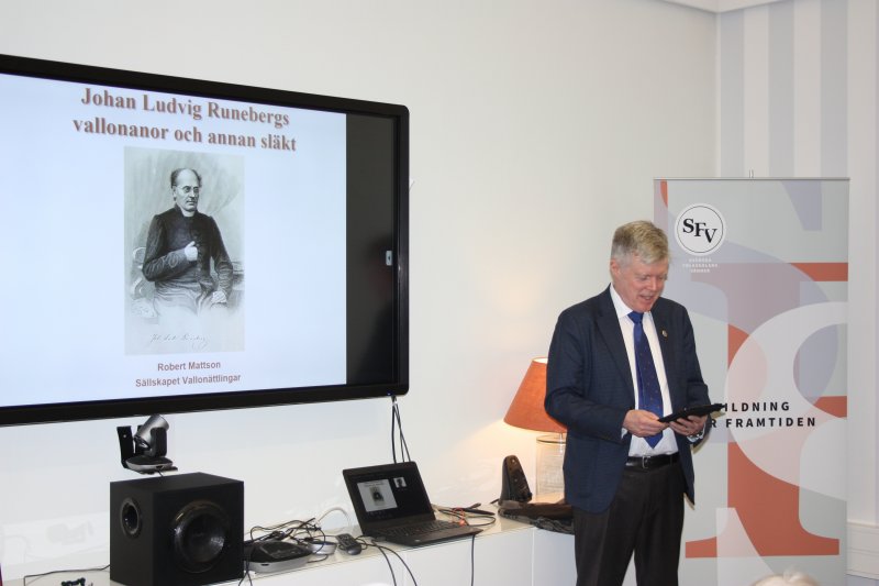 Saamme Ruotsista Robert Mattsonin luennoimaan. Hän kuuluu Ruotsin valloniyhdistykseen nimeltä Sällskapet Vallonättlingar. Tämä osio on ruotsin kielellä. Mattson on tutkinut ja perehtynyt Runebergin taustaan ja hänen vaimonsa Christina Tersmeden on myös sukua Runebergille. Molemmat ovat paikalla. Luento-osuus no 2 on Vallonit, ruukit, sukututkimus ja DNA, jonka pitää puheenjohtajamme Kenneth Silver. Tämä osio on suomen kielellä.